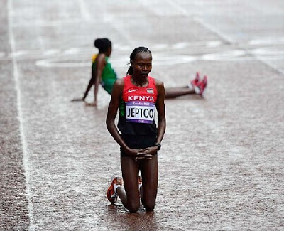 •A foto mostra a etíope Tikini Gelana ajoelhada e exausta após vencer o duelo, por uma diferença de apenas cinco segundos, contra a queniana Priscah Jeptoo, que cai, também exausta. (Foto: Mike Powell)