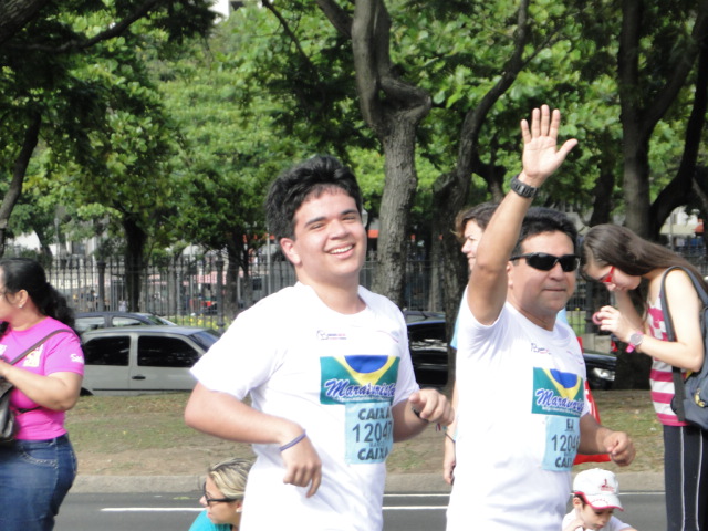 Corremos conversando sobre a prova, sobre corridas. Ouvíamos piadas e ríamos. Vez por outra, perguntava se ele estava se sentindo bem. Era mais preocupação de pai do que qualquer exteriorização de expressão de dor por parte dele. Passamos no quilômetro três e fizemos a hidratação. Estávamos num ritmo de 6min30/km, porém, não informava a ele. Apenas comentava sobre a distância que o GPS denunciava ao apitar.