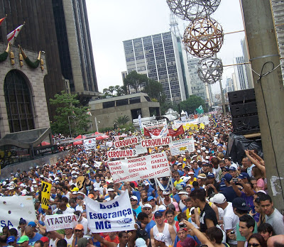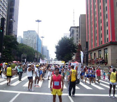As fotos abaixo são da largada da 84ª edição da Corrida Internacional de São Silvestre, em 2008. A largada da SS é diferente das outras provas. É pura festa, alegria e descontração. Aparece cada figura. Muita gente corre fantasiado, com faixas, protestando. Somente a elite corre pra valer!