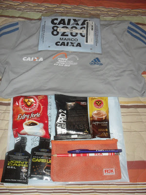 O kit da Meia Maratona Internacional do Rio desse ano, veio composto de uma camiseta promocional do evento da Adidas, por sinal muito boa; número do peito (8286); chip descartável; uma bolsinha porta-treco com caneta e lápis da Escola FISK; amostra grátis de café e cappuccino Três Corações; suplementos alimentares da Probiótica.