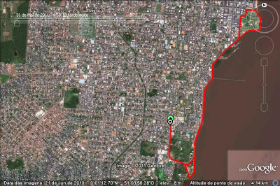 O Garmin registrou 11,37 km de distância percorrida, num tempo total de 1h12min, frequência cardíaca média de 151 batimentos por minuto e 865 calorias perdidas. O percurso está registrado na imagem de satélite abaixo, obtida a partir do GPS do Garmin.